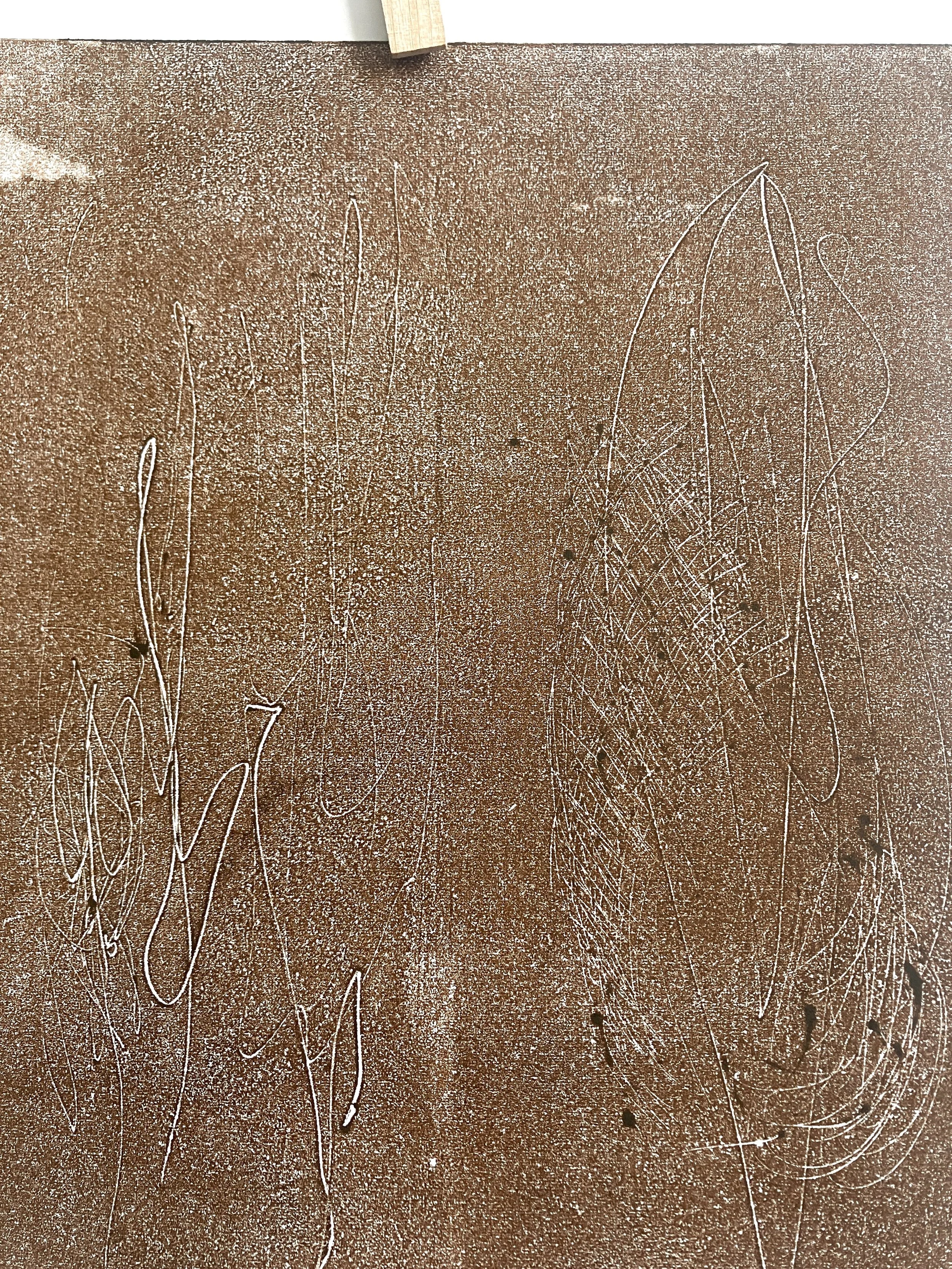 Through woodblock and mono printing, I’m creating figures to represent the nuances, the “ambivalences,” in the decisions behind vocalized language.